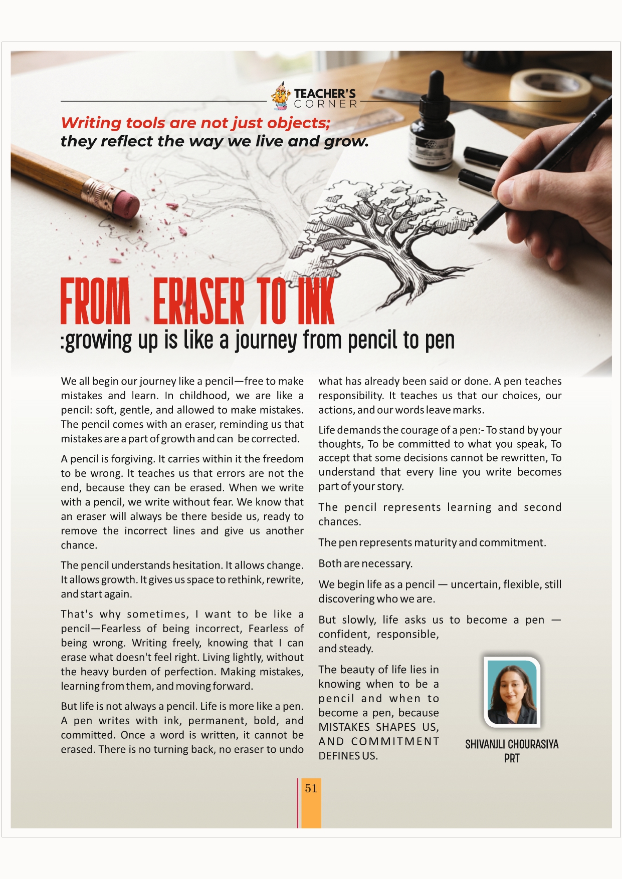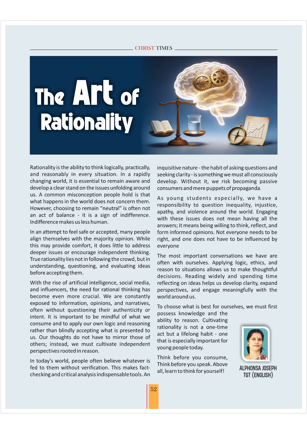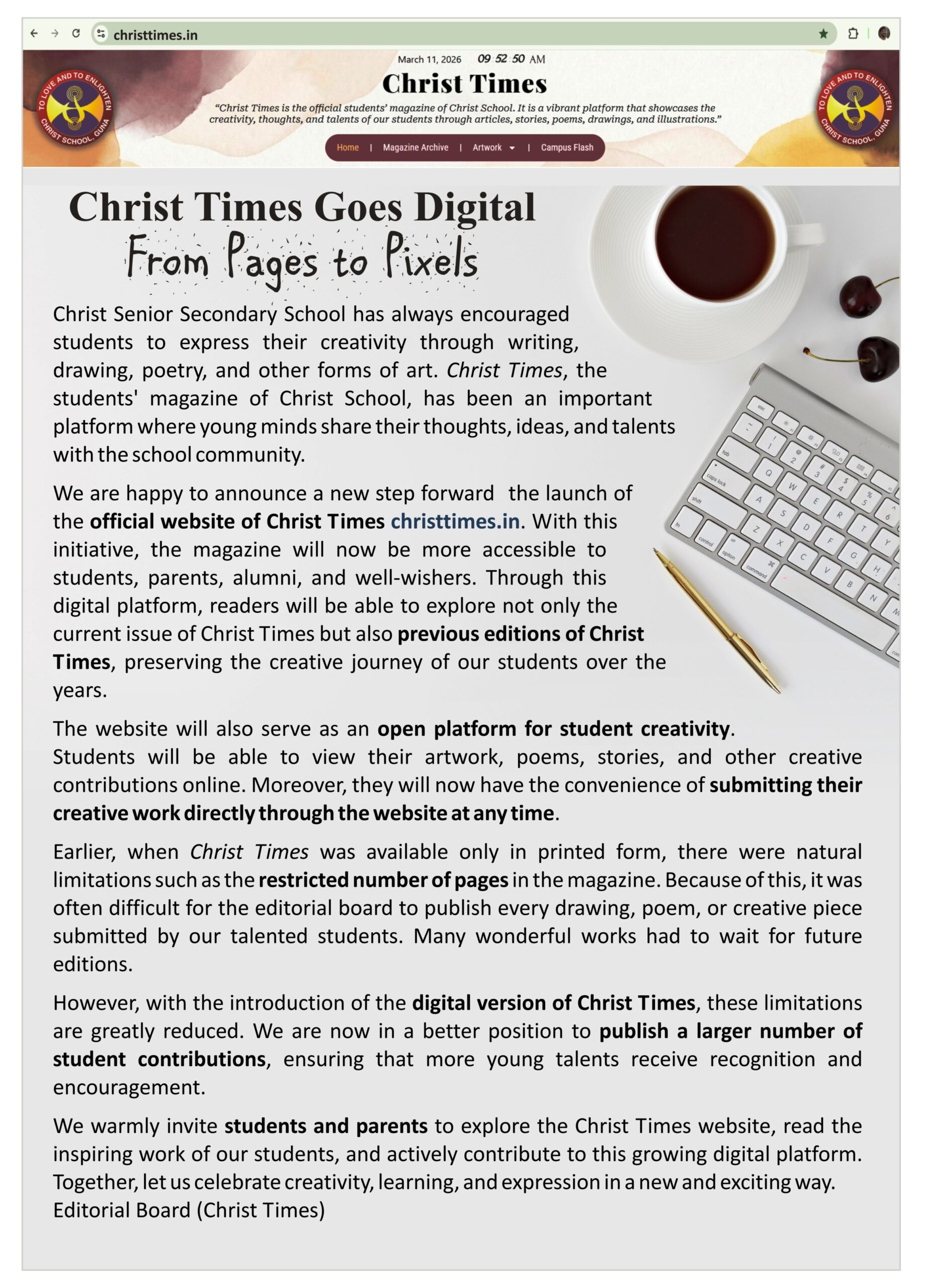 I would like to congratulate the editorial team, on their outstanding work in bringing out Christ Times. I also thank our contributors, teachers, and parents for contributing articles.