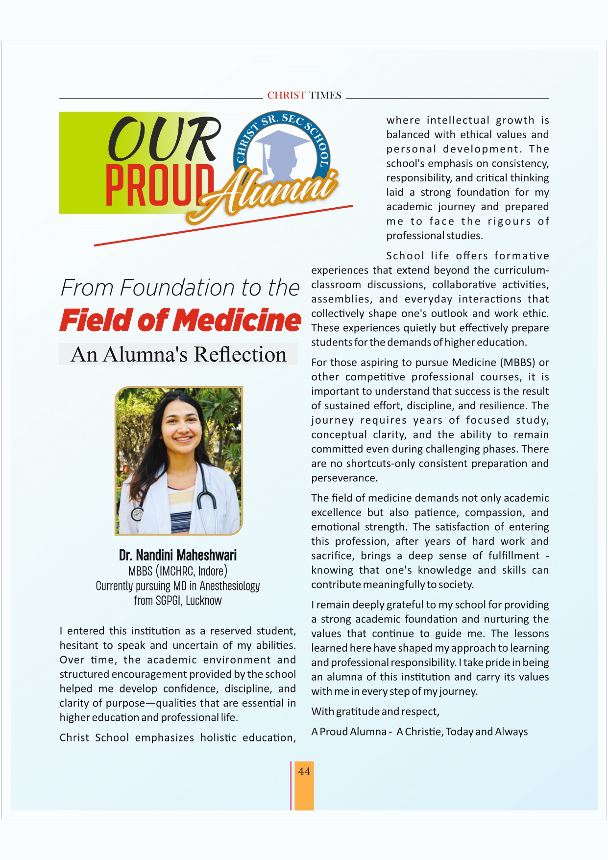 I would like to extend my heartfelt thanks to our parents for their invaluable cooperation and support throughout the year. Over the past forty-seven years, Christ Senior Secondary School has grown and flourished, thanks to the collective efforts of our students, parents, staff, and management. We are proud of our alumni who have gone on to make a mark in their respective fields and continue to cherish the values and memories of their time here.